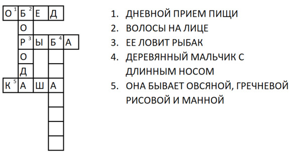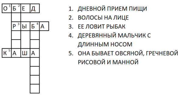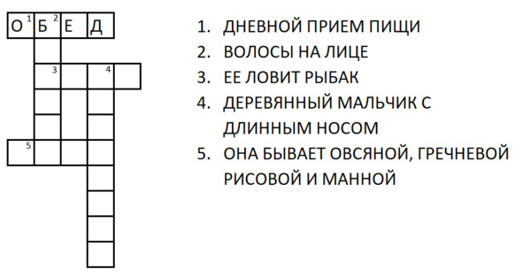 — Первое слово, это очень просто. Дневной прием пищи, это обед, ничего другого и быть не может. И по буквам подходит. — сказал Петя, довольно глядя на свою работу.