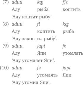 Более того, если расширить кругозор, окажется, что это не невозможная черта. Например, именно так устроено время в языке аттие (Кот-д'Ивуар)7. Вот несколько примеров предложений на этом языке (в упрощенной транскрипции), из которых видно, что в этом языке в настоящем времени используется порядок слов Подлежащее — Дополнение — Сказуемое, а в прошедшем времени — Подлежащее — Сказуемое — Дополнение8: