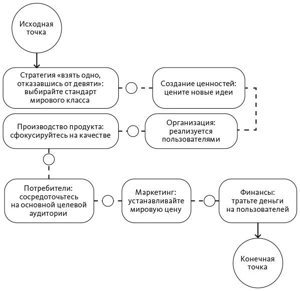 Выбор предпринимателя формирует ДНК компании, а это, в свою очередь, определяет ее жизнеспособность. Принимая стратегию, руководитель выбирает стандарт. Этот стандарт задает основной продукт, а продукт — тип привлекаемых потребителей… Иными словами, выбор предпринимателя напрямую влияет на итоговый результат.