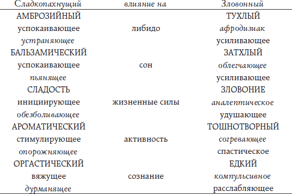 Более проработанную схему Линней опубликовал в 1766 году в труде «Два ключа медицины («Clavis medicinae duplex»). В терапевтическом ракурсе «способы жизни» коррелировали со «свойствами природы». Линней описал пять принципов противоположного действия по шкале сладких и «дьявольских» (в переводе Хогга) запахов. Интерес к аффективной природе ароматов также затрагивал их влияние на поведение. Шведский врач и отец современной физиологии Альбрехт фон Галлер заинтересовался изменением ощущения запаха во времени. Например, запахи свежего мускуса или виверры поначалу отталкивают и напоминают вонь фекалий, но потом приобретают более приятные ноты. Распадающаяся плоть на разных стадиях разложения несколько раз меняет запах – от гнилостного до сладкого. Казалось, существует бесконечное множество вариантов классификации запахов. В «Elementa physiologicae» Галлер разделил запахи по трем основным принципам привлекательности: сладкие (или амброзийные), промежуточные и зловонные. Эти категории включали разнородный набор – от запаха шафрана до запаха фекалий или «запаха клопов, обнаруженных в кориандре».