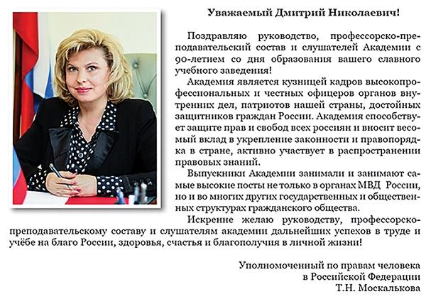 С особой гордостью и удовлетворением считаю нужным отметить, что Татьяну Николаевну Москалькову — генерал-майора милиции — связывают давние прочные научно-методические связи с Нижегородской академией МВД России. В академии с 2003 года активно разрабатывается по самым разным аспектам правозащитная тематика (проведено 35 мероприятий), что отнюдь не просто с учетом профиля вуза и специального режима его функционирования. И многие из этих научных и дидактических разработок проведены при участии либо при помощи Т.Н. Москальковой.
