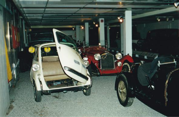 Белый автомобильчик в окружении красной Alfa Romeo 1750 Gran Sport и черной Bugatti Туре 37 это BMW Isetta 1958 г. в. с единственной расположенной спереди дверью