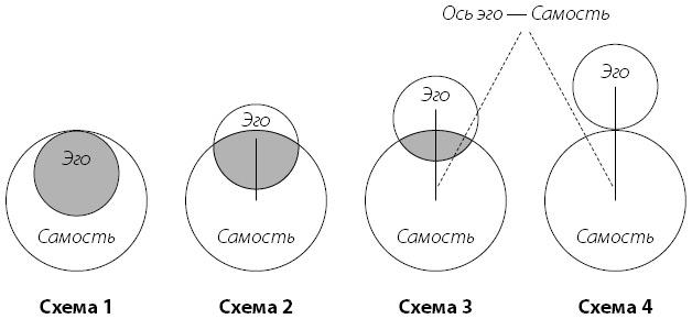 На этих схемах показаны последовательные стадии отделения эго от Самости на протяжении психологического развития. Заштрихованные участки окружности эго обозначают остаточную тождественность эго и Самости. Соединительная линия между центром круга Самости и центром круга эго представляет собой ось эго — Самость, которая выполняет жизненно важную роль соединительного звена между эго и Самостью, обеспечивающего целостность эго. Следует учитывать, что эти схемы предназначены для иллюстрации определенной мысли и поэтому не характеризуются строгостью в остальных отношениях.