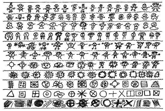 Илл. 1. Последовательность размещения гештальтов в направлении снизу вверх отражает возможное развитие изображения человеческих фигурок на рисунках детей младшего возраста.