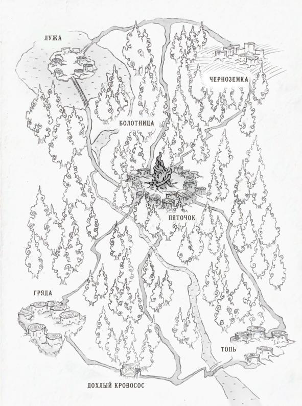 Вскоре с супом было покончено, и большинство лесорубов принялись курить трубки, наполняя комнату тягучим дымом, едва успевающим просачиваться сквозь круглые отверстия в стене. Обычно в конце рабочего дня, если везло, бригады останавливались в таверне «Дохлый Кровосос», расположенной на перекрестке дорог, ведущих от Пятачка, Топи и Гряды. Тут ждал вкусный ужин, выпивка и соломенные матрасы на втором этаже. Сам же трактир был вырублен в стволе некогда могучего дерева и занимал не самую большую его часть. Стены внутри изрядно закоптились и обсохли, так что лиственный гигант, ныне пень, даже не замечал того, что в его основании образовался трактир. Место же служило для лесорубов и путников перевалочным пунктом, где можно было отдохнуть, поесть и переждать ночь, когда умертвия выходят на охоту.