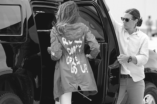 Во время визита в центр содержания детей нелегальных мигрантов в Техасе в 2018 г. первая леди США Мелания Трамп надела легкую парку цвета хаки от испанской фирмы Zara — известного ретейлера на рынке быстрой моды — с надписью в стиле граффити на спине: