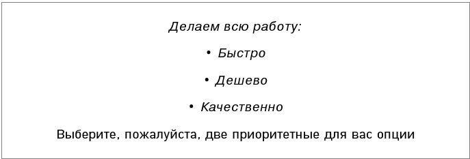 Треугольник же демонстририрует, что при ограниченных ресурсах, двигаясь к одной из задач, мы на то же расстояние отдаляемся от другой задачи. Попытавшись реализовать все три задачи одновременно с одинаковой отдачей, мы остановимся посреди треугольника, так и не достигнув ни одной. Позвольте проиллюстрировать эту ситуацию профессиональным анекдотом-былью из арсенала проектных менеджеров.