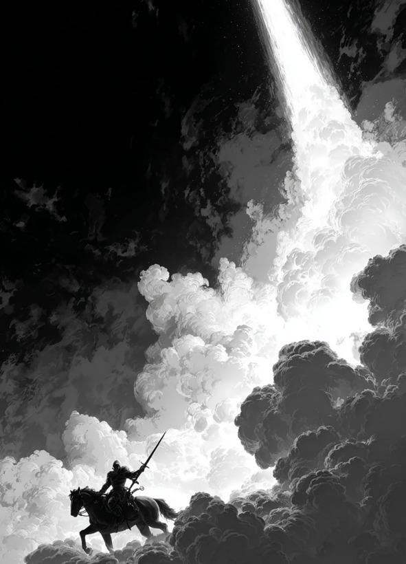 Внезапно тишину разорвал гул самолета. Я выглянул из беседки и замер, глядя в небеса. Заря расцвечивала небо, и его пронзала чёткая белая полоса, оставленная самолётом. Обычный след в небе преобразился, явив дымчатого всадника с мечом в руке.