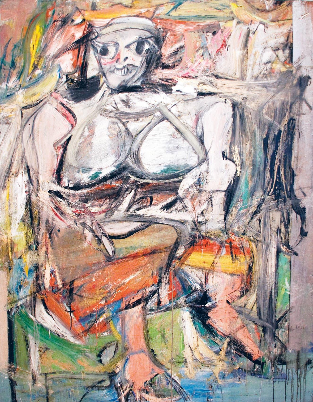 В 1953 году де Кунинг представил в нью-йоркской галерее Сидни Джениса Картины на тему женщины. Показанные на этой выставке работы вошли в число самых знаменитых произведений нью-йоркской школы; они изображают женские тела, в которых чувствуются переклички как с доисторическими богинями плодородия вроде Венеры Виллендорфской, так и с красотками с календарей 1940-х годов. В контексте творчества де Кунинга Женщины связаны с этюдами мужских и женских фигур, которые он писал в конце 1930-х — 1940-х годах: тела там то распадались на множество биоморфных форм, то вновь собирались из них воедино. На протяжении 1940-х годов даже самые, на первый взгляд, беспредметные картины де Кунинга включали в себя подобные органические формы, образуя абстрактные поля, напоминающие изгибы раскрепощенной плоти. В Женщинах начала 1950-х насилие, имплицитно присутствующее и в более ранних фигуративных работах художника, усугубляется «шлепками» красочных полос, идущих через весь холст, и преувеличением грудей, губ и глаз, в котором часто узнаются огрубленные, карикатурные образы гротескной сексуальности (илл. 7). Как для исследовательниц-феминисток 1980-х и 1990-х годов, так и для многих критиков-мужчин 1950-х эти работы стали проявлением гендерной политики, характерной не только для де Кунинга, но и для абстрактного экспрессионизма в целом, где жестуальный акт мужчины-художника метафорически соотносится с мужской сексуальной потенцией и с патриархальными ценностями, прославляющими ее как источник всего человеческого творчества. Уже в 1953 году Сидни Гайст в рецензии на выставку в галерее Джениса ясно выразил эту точку зрения: «В жесте, родственном половому акту, [де Кунинг] обрушивает насилие на холст, который и есть женское тело».