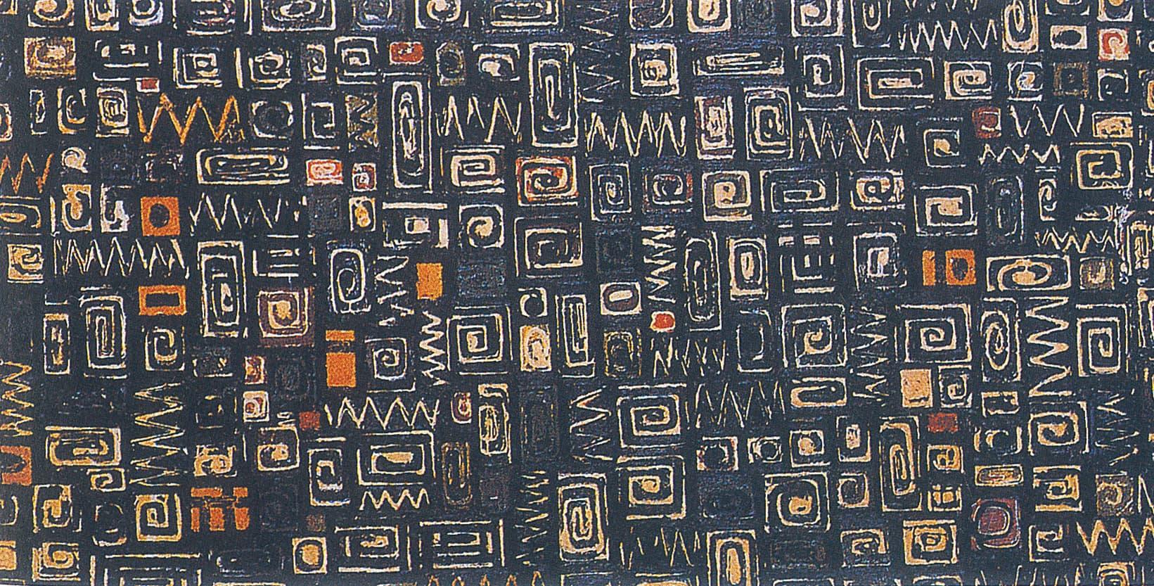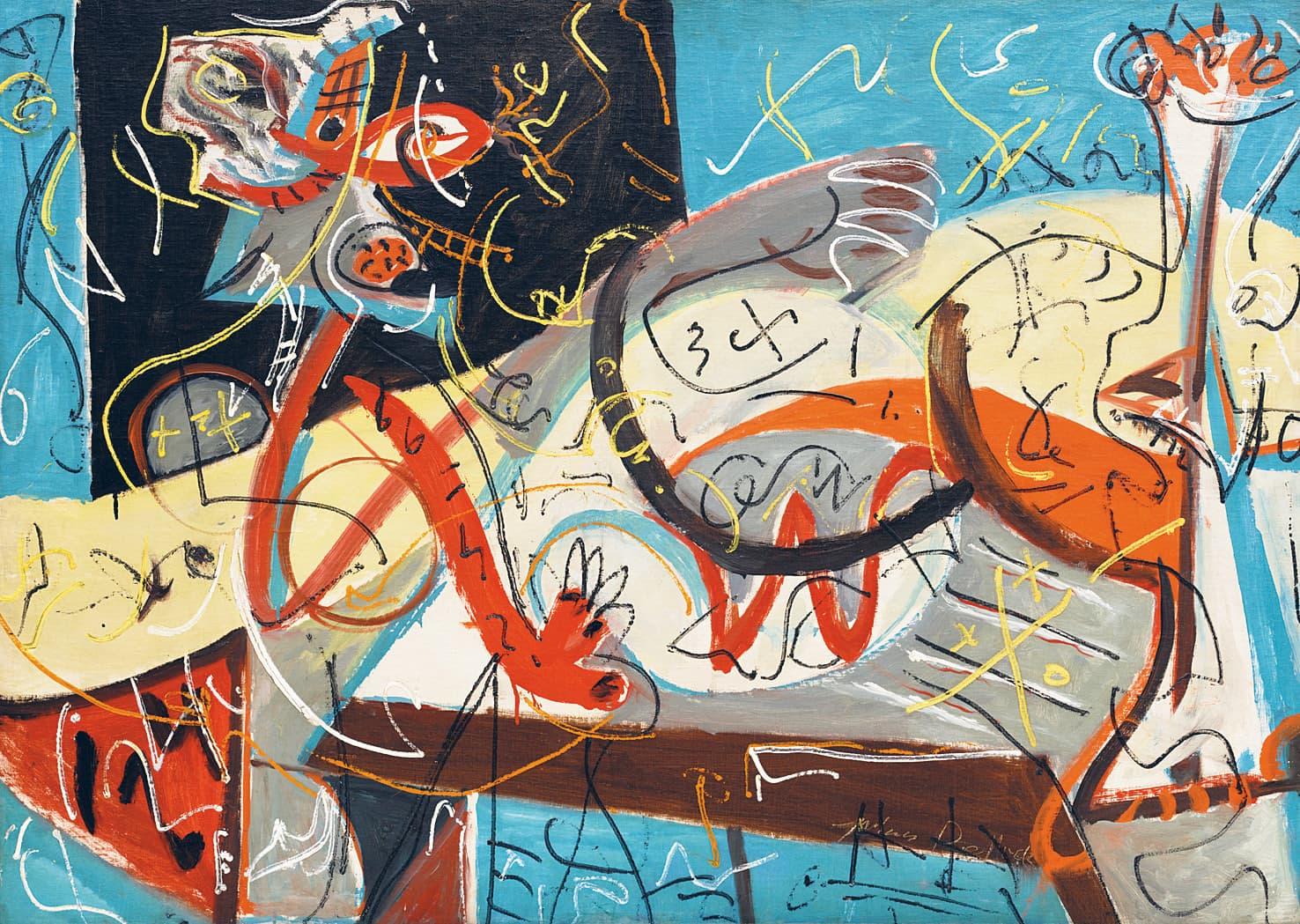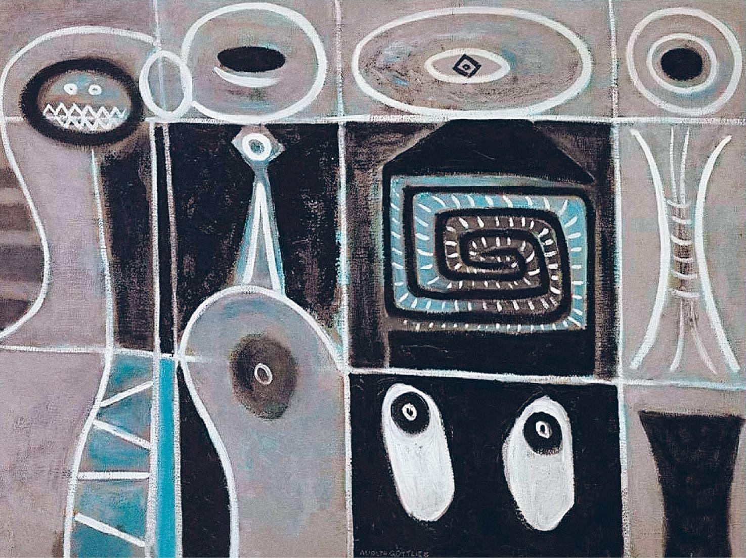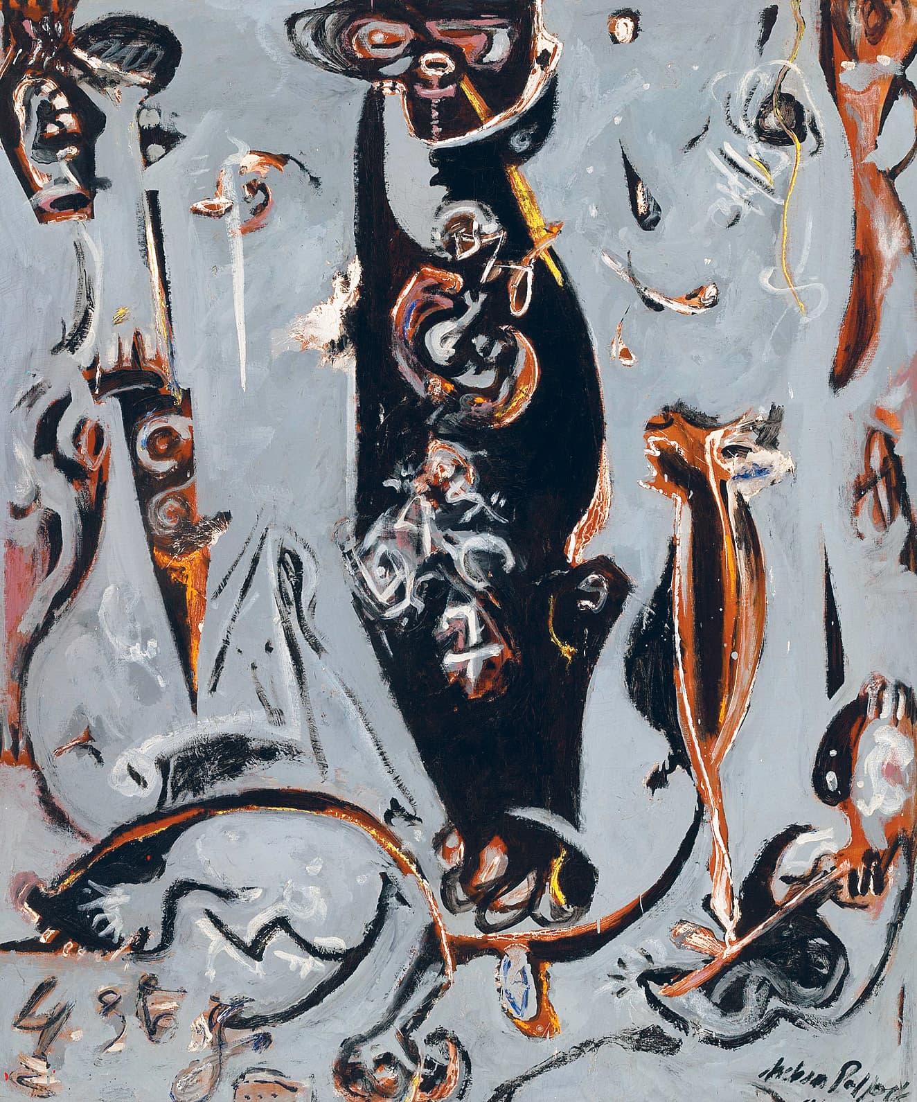В увлечении художников нью-йоркской школы мифической образностью можно проследить двухступенчатое развитие. Первым шагом было для них усвоение тотемных форм, навеянных существующими племенными или архетипическими источниками и нередко воспринятых сквозь призму интереса к сюрреалистическому автоматизму. У Поллока, например, имелось несколько томов Годовых отчетов Бюро американской этнологии, содержащих репродукции юго-западной индейской живописи на песке — детальных изображений космологических фигур, временно начертанных на земле для туземных церемоний. В 1939 и 1940 годах Поллок проходил юнгианский анализ у доктора Джозефа Хендерсона, который предложил ему приносить на сеансы для обсуждения свои рисунки, наполненные архетипическими символами. Эти занятия сказались на многих картинах Поллока 1940-х годов, в числе которых можно упомянуть Стенографическую фигуру (1942; илл. 9), Хранителей тайны (1943), Тотемный урок I (1944) и Тотемный урок II (1945; илл. 10), где призраки продолговатых фигур песочной живописи навахо угадываются среди символических форм, изобретенных самим художником.