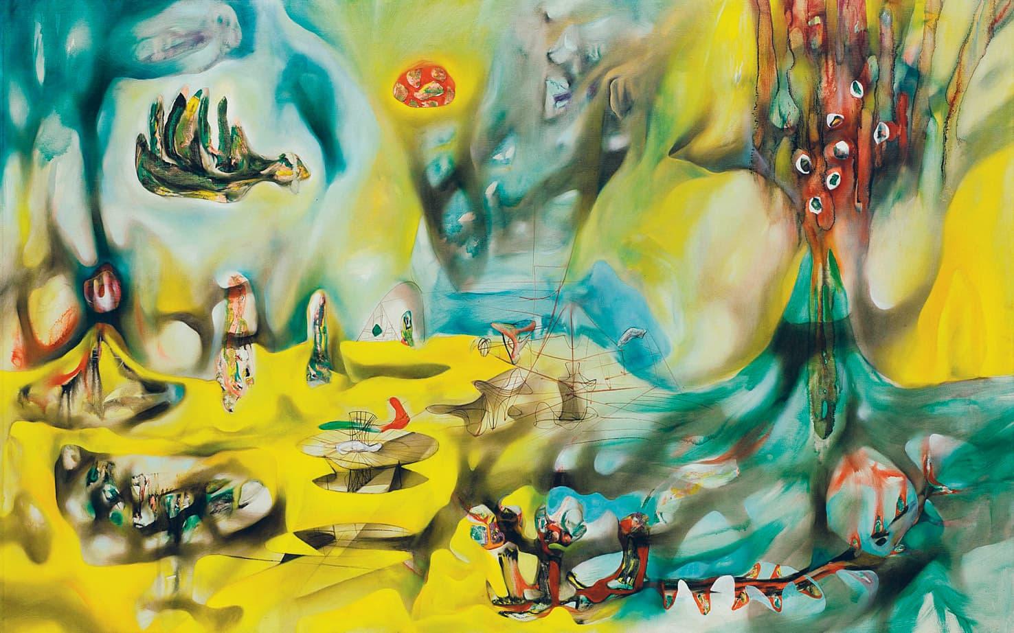 Картины Ротко начала и середины 1940-х годов, например Жертвоприношение Ифигении (1942), Первобытный пейзаж (1944) (илл. 11) и Обряды Лилит (1945), также населены тонкими вытянутыми тотемными формами на фоне полос модулированного цвета и в целом представляют собой фантазийные, вдохновленные сюрреализмом трактовки античных мифов. Барнетт Ньюман обращался к мифологии в 1940-х годах через свое увлечение темой генезиса и роста. Его работы того периода часто содержат связанные с органикой роста и плодородия формы яйца, солнца, семян, иногда в сочетании с отростками, напоминающими стебли или стволы деревьев. В таких картинах, как Гея (1945) или Языческая пустота (1946), тема генезиса исследуется на трех уровнях: через естественные или органические жизненные циклы, через мифологическое осмысление этих циклов и, наконец, в русле стремления абстрактных экспрессионистов вернуть живопись к ее истокам. Подобное пересечение растительного и живописного начал отличает и живопись Аршила Горки (1904–1948), чьи образы порождены пристальным наблюдением природы (илл. 12). Размеченные нерегулярной решеткой картины Адольфа Готтлиба (1903–1974) 1940-х годов, например Узники (1946) (илл. 13) или Отделение тьмы (1947), включают в себя ряды тотемных форм, которые четче других соотносятся с определенной моделью в культуре коренных народов — в данном случае с живописью на древесной коре индейцев Северо-Западного побережья.