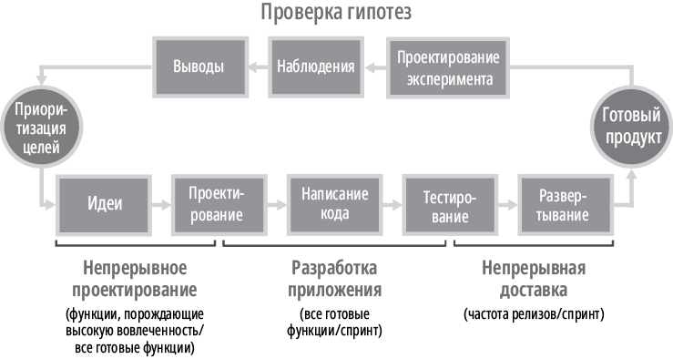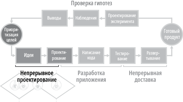 HDD — разработка, основанная на гипотезах, — возникла как концептуальная модель, призванная обеспечить более эффективный подбор инновационных практик под решение конкретных задач и их интеграцию в процесс работы команды. И, по моему опыту, непрерывное проектирование — та область деятельности, в которой команды могут извлечь из HDD максимум пользы. Связь непрерывного проектирования и HDD отражена на рис. 2.1.