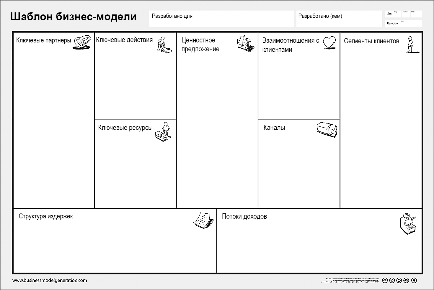 Показатель product/market fit (соответствие продукта рынку) как раз и определяет точку равновесия между инновациями и масштабированием. В общем и целом идея состоит в том, что если определенный продукт достигает этого соответствия, значит, его можно масштабировать. Очень часто концепцию product/market fit описывают через построение бизнес-модели по шаблону, придуманному Александром Остервальдером (рис. 1.3).