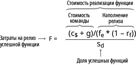Кратко рассмотрим каждую из переменных в формуле. Числитель — отношение стоимости к наполнению релиза, то есть стоимость реализации определенной функции. Чтобы определить ее, нужно знать, сколько стоит команда. Эта стоимость рассчитывается так: мы берем заработную плату членов команды и связанные с ней расходы наподобие бонусов — c$ — и добавляем к ней стоимость необходимого оборудования и сервисов, которыми пользуются участники команды — g. Затем мы численно выражаем результат работы команды за определенный период времени — в формуле это fe. Теперь переходим к rf — последнему элементу, который мы учитываем при расчете того, сколько стоит реализация какой-либо функции командой. Показатель rf (release friction, трение релиза) отражает, сколько времени команда тратит на такие действия, как ручное тестирование и устранение ошибок. Брать его в расчет необязательно, но суть рассматриваемого равенства состоит в том, чтобы учесть самые разные факторы, которые влияют на величину F, а rf зачастую является достаточно весомым фактором. Еще более значимым фактором является знаменатель дроби, sd, который обозначает долю успешных функций и на который мы делим, чтобы рассчитать, сколько стоит реализация не функции вообще, а именно успешной.