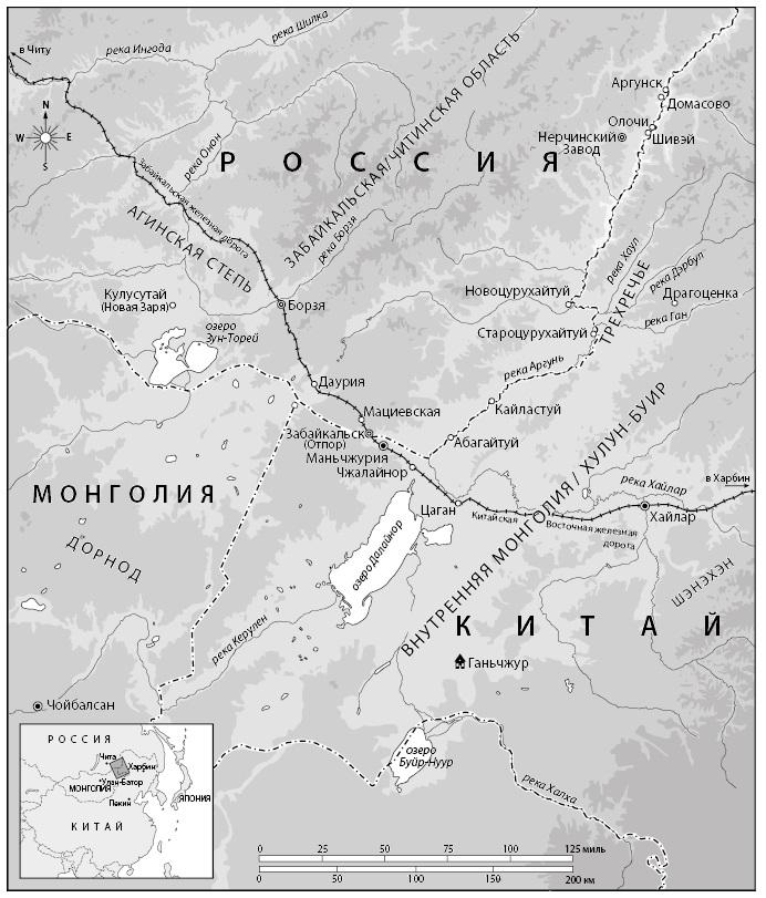 Территория, на которой мы сосредоточим внимание, расположена в сегодняшнем российско-китайско-монгольском пограничном треугольнике в верховьях реки. С севера и востока она ограничена горным хребтом Большой Хинган, а с юга и запада — пустыней Гоби. Территория охватом около семидесяти тысяч квадратных километров соразмерна по масштабам с современной Грузией. Окраины этого региона примерно соответствуют внешним пределам свободной торговой зоны, установленной в 1862 году, и отдельной административной структуре пограничных районов, которые начали создаваться с конца 1920‐х годов. Другими словами, окраины этого региона могут быть описаны так: немного пологая равнина Агинской степи, где река Борзя впадает в Онон и обозначает его западные пределы. Казацкая станица Олочи на среднем течении Аргуни отмечает его северный край. Предгорья лесных склонов Большого Хингана, отделяющие плоскогорье Хулун-Буира от Маньчжурской равнины, маркируют его восточные пределы. Река Хайлар — приток Аргуни, которую иногда считают верховьем реки Аргуни, и мелководное озеро Далайнор отмечают ее южную окраину.