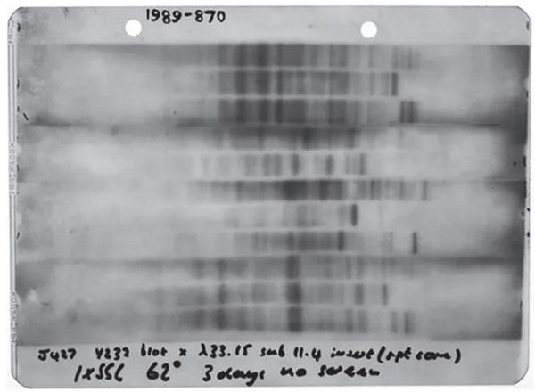 Рис. 2. Рентгенограмма, на которой запечатлен первый генетический «отпечаток пальца», подготовленный А. Джеффрисом в Лестерском университете (сентябрь 1984 г.)13