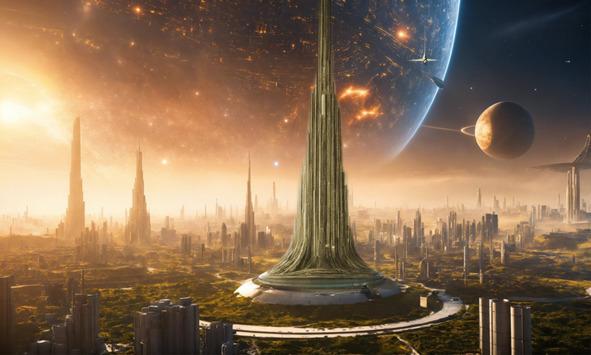 В центре его находится командная башня, выходящая в стратосферу, чтобы принимать волновые сигналы Конта. Так высока башня, что никто не осмелится подняться пешком на самый её верх. Есть ещё ангары — аккуратные стойла железных «хищников», военных звездолётов, и унифицированные бараки для отдыха солдат.