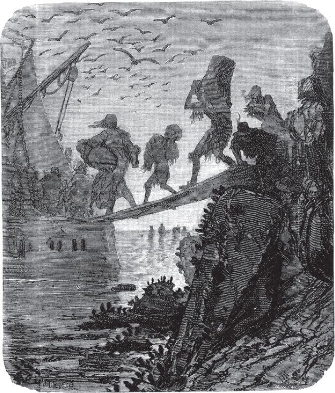 Бухта, сжатая со всех сторон высокими отвесными берегами, намного превосходящими ее по размерам, с каждой минутой погружалась в темноту; туман, обычно подымающийся к ночи, все сгущался; становилось темно, как в глубоком колодце; узкий выход из бухты в море выделялся беловатой полоской на фоне ночного сумрака там, где мерно плескался прибой. Только подойдя совсем близко, можно было заметить урку, причалившую к прибрежным скалам и как бы укрывшуюся огромным плащом отбрасываемой ими тени. С берегом ее соединяла доска, перекинутая на низкий и плоский выступ утеса – единственное место, куда можно было поставить ногу; по этому шаткому мостику сновали во мраке черные фигуры, очевидно готовясь к отплытию.
