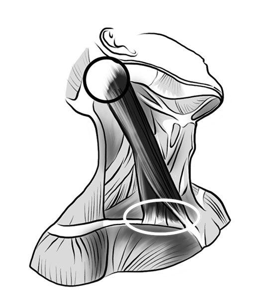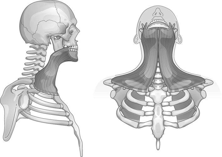 Эта мышца присоединяется к первому ребру и к нижней челюсти.