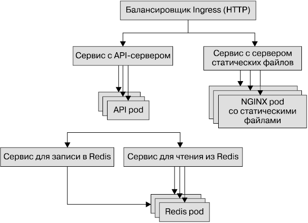 Прежде чем определять ресурс Ingress, следует создать Kubernetes Service, на который он будет указывать. А чтобы связать этот Service с pod, созданными в предыдущем разделе, мы воспользуемся метками. Определение Service выглядит намного проще, чем ресурс Deployment: