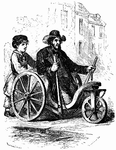 As he drew nearer, he found it was not a boy in the carriage, but a man without legs. He had met with a dreadful accident, and been obliged to have both his legs cut off; and now he was trying to support himself by selling pictures, rolling himself in his carriage from house to house by means of a crank wheel. This was very hard work for him, especially when he was going uphill; sometimes he was obliged to get boys to push behind.