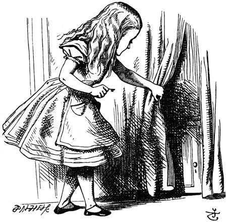 Обходя зал во второй раз, Алиса заметила занавеску, на которую раньше не обратила внимания. Приподняв её, Алиса увидела низенькую дверцу высотой сантиметров тридцать. Она попробовала вставить ключ в замочную скважину, и, к её величайшей радости, он подошёл!