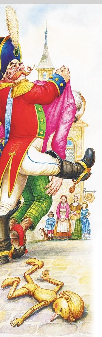 На перекрёстке стоял огромный полицейский с закрученными усами и в треугольной шляпе. Увидев бегущего деревянного человечка, он широко расставил ноги, загородив ими всю улицу. Буратино хотел проскочить у него между ног, но полицейский схватил его за нос и так держал, покуда не подоспел папа Карло.