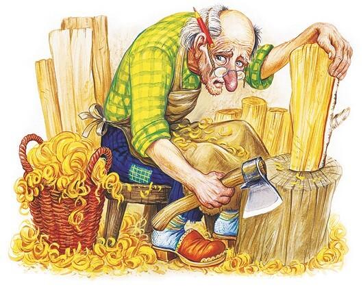 Карло вошёл в каморку, сел на единственный стул у безногого стола и, повертев так и эдак полено, начал ножом вырезывать из него куклу.