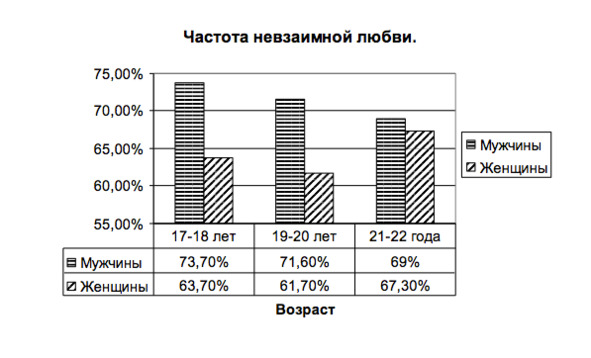 У мужчин в первой группе невзаимная любовь была в 73,7% случаев, во второй — 71,6%, в третьей — в 69% случаев.