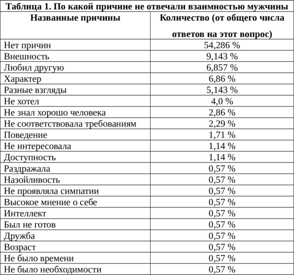 Примерно 54% ответов юношей и 45% ответов девушек показывают, что они сами не могут назвать конкретную причину своей нелюбви (р> 0,005). По результатам нашего исследования, как у юношей, так и у девушек при невзаимной любви бессознательные и сознательные причины встречаются примерно в равном количестве случаев.