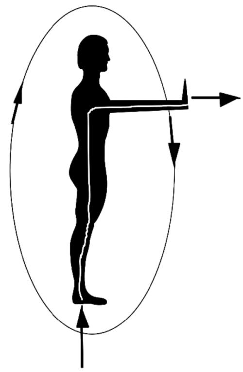 Те, у кого работает обратный круг, проводят энергию по передней поверхности тела наверх, затем через шею вниз по спине (рис. 2 б), энергетическое кольцо замыкается, и энергия снова идет наверх. У них происходит забор энергии через точки входа и выхода рук и сброс энергии через точки входа и выхода ног. Эти люди обычно худые и нервные.