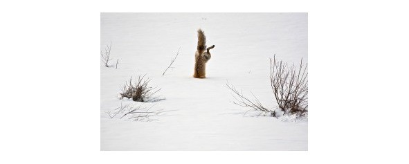 Кругом лежит снег и никого не видно. Но лисица вдруг останавливается, словно заприметила кого-то. Оказывается, зимой под снегом эта хищница может почуять мышь. Основным кормом для лисицы в это время года являются грызуны. Вот она остановилась. Прыжок, и лисица ныряет прямо в снег.