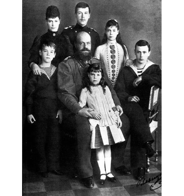 Стоят слева направо: младший сын Михаил, Императрица Мария Фёдоровна, Наследник Николай, дочь Ксения, сын Георгий сидит и в центре — младшая дочь Ольга
