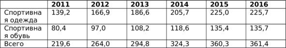 Таблица 1.1 Объем продаж спортивной одежды и обуви в России (млрд. руб.)