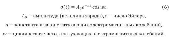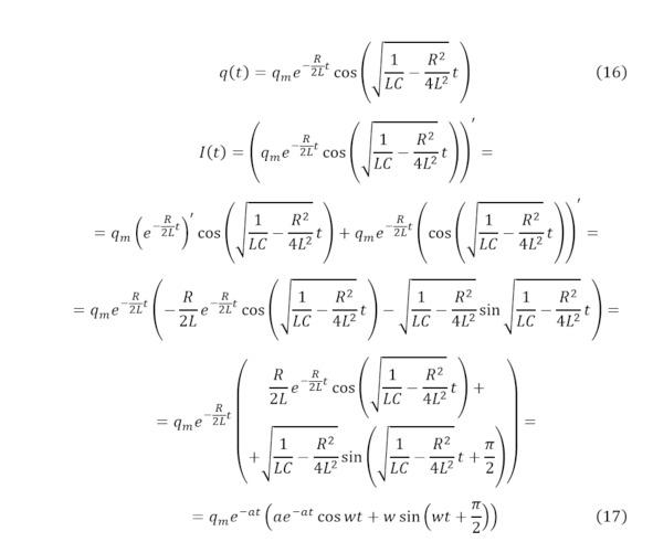 Таким образом была получена формула для циклической частоты затухающих колебаний, нулевой циклической частоты из закономерностей (15), которую можно подставить в (6), получив формулу для заряда (16), взяв производную, от которой можно получить выражение для силы тока (17).