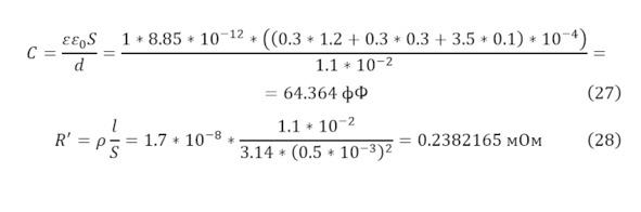 Перед продолжением исследования, укажем действующую частоту УВЧ диапазона в рамках 860—960 МГц, при том, что для статичного случая принимается минимальная величина. При тех же условиях, устанавливается величина ёмкости конденсатора (27) и первоначальная величина сопротивления (28).