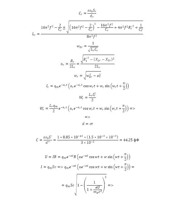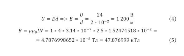 При этом, в настоящем случае образуется электрическое и магнитное поле, которое в каждый период частоты доходит до своего максимального положительного значения и уменьшается до минимального отрицательного значения. В модуле, максимальная величина электрического поля определена в промежутке между пластинами и может быть определена, как (4), когда же максимальное магнитное поле в центре соленоида в (5).