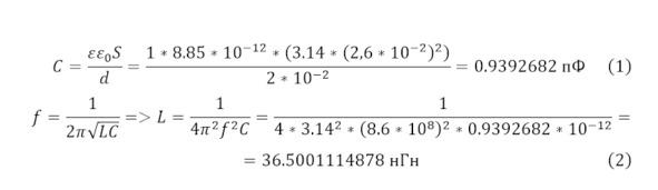 — 860 МГц, это позволяет при диаметре пластины конденсатора ридера в 5,2 см и расстоянии между пластинами в 2 см определить ёмкость такого плоского конденсатора (1), а также индуктивность катушки (2).