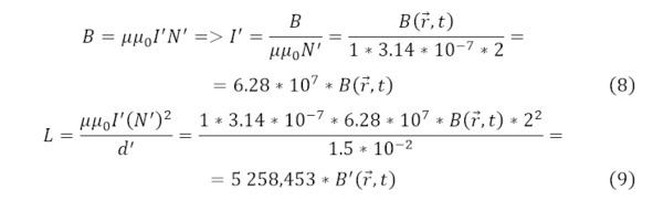 В настоящей форме наглядно видно, что даже при максимальном значении электрического и магнитного поля, величина электрического поля значительно превышает величину магнитного поля. Также, когда электромагнитная волна дойдёт до RFID-метки, то электрическое поле приведёт к включению конденсатора, а магнитное — катушек. Используя это утверждение, можно вывести выражение для силы тока метки, зависимая от величины вектора магнитной индукции, зависимая от координат и времени (8), что приводит также к определению такой же зависимости между индуктивностью и вектором магнитной индукции (9).