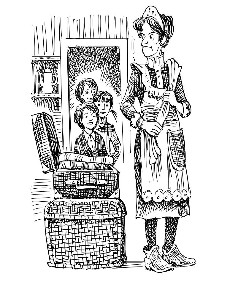 На лицах девочек отразилось глубокое сомнение. Их прежняя экономка была толстенькая, кругленькая и весёлая и смотрела на всех строго, но добродушно. У этой экономки лицо было узкое, длинное и недовольное, губы сжаты в тонкую линию. Женщина растянула их в улыбку, но глаза её остались холодными.