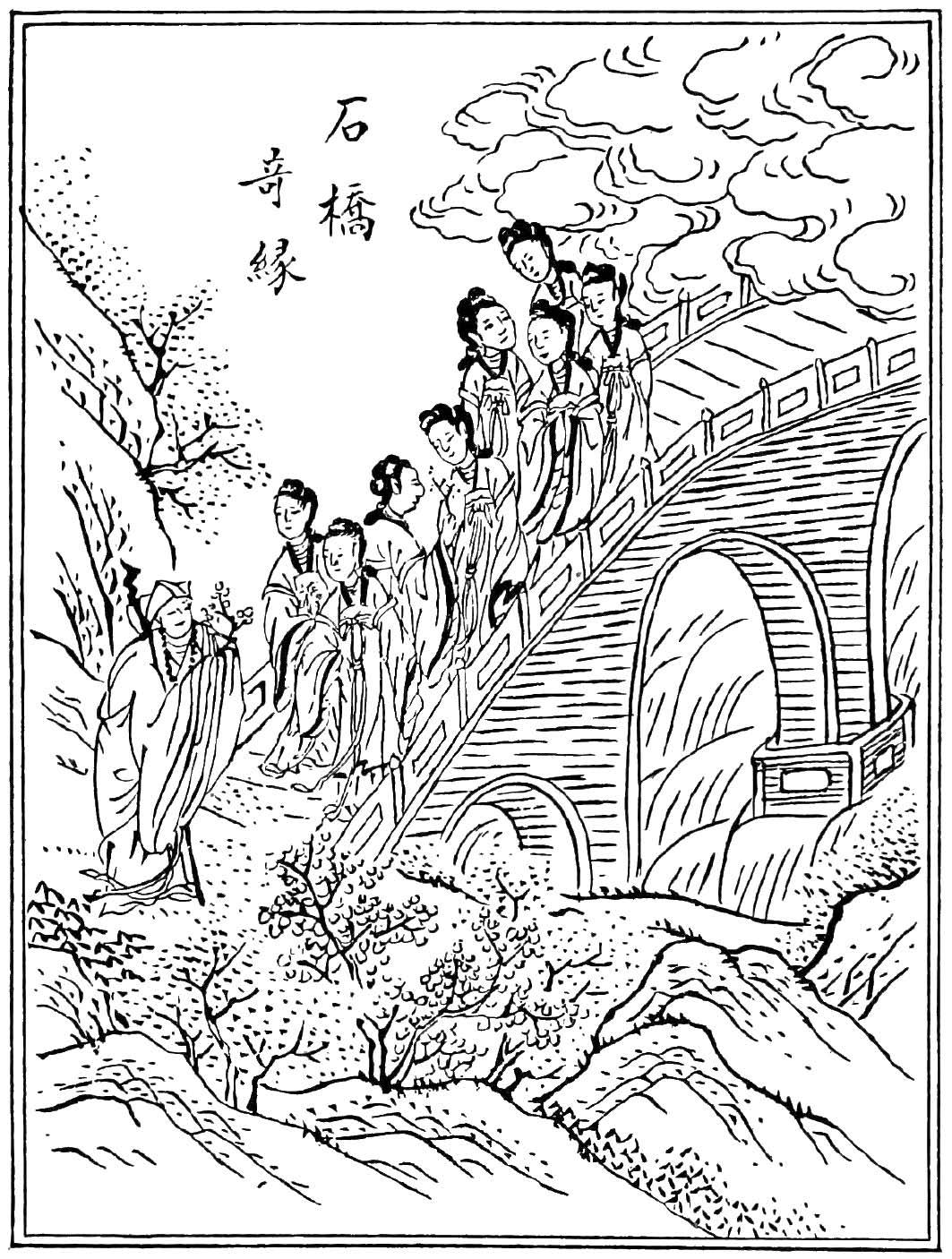 «Возможно, в верховьях реки есть какой-нибудь необыкновенный цветок, и запах его долетел по течению до этих мест? — предположил он. — Пойду-ка поищу». Одевшись, он зашагал вдоль реки и на Каменном мосту лицом к лицу столкнулся с восьмью феями, которые все еще продолжали сидеть там. Отставив посох, Сон Чжин сложил в приветствии руки и смиренно обратился к феям:
