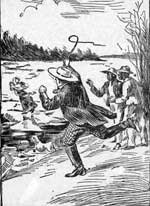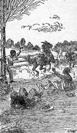 Whenever it seemed likely that a horse would be caught, Sam ran up, waving his hat and shouting wildly, 'Now for it! Cotch him! Cotch him!' This frightened the horses so much that they galloped off faster than before.