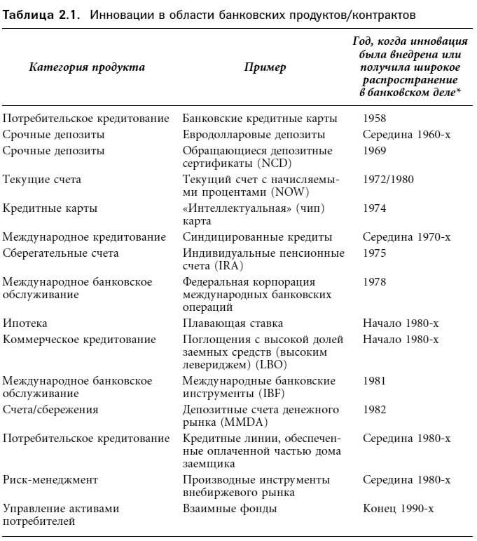 Первая значительная банковская инновация — появление первого свободно обращающегося депозитного сертификата (CD) — относится к февралю 1961 г. Инновация чрезвычайно быстро завоевала популярность среди широких масс: в настоящее время термин CD известен любому участнику рынка. Банковский депозитный сертификат, выпущенный Первым национальным банком Нью-Йорка (позднее Citibank/Citicorp, а ныне Сitigroup), оказался чрезвычайно значимым инструментом, поскольку позволил банкам привлекать средства и таким образом управлять своими пассивами. (К этому периоду относится и возникновение термина «управление пассивами». Подробнее см. гл. 11.) Торгуемые банковские CD оказались первыми инструментами новой эпохи инновационных контрактов, новых технологий в области осуществления финансовых сделок. С этого момента на рынке непрестанно появляются самые разные финансовые и технологические новшества. В табл. 2.1 представлен перечень некоторых инноваций в сфере коммерческого банковского обслуживания.