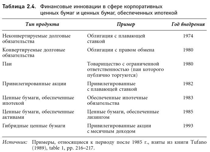Большинство финансовых инноваций объясняется влиянием либо рынка, либо регулирующих органов (третья предпосылка Кейна). Как правило, внедрение инновации обусловлено совместным действием тех и других. В конце 1970-х — начале 1980-х годов новые сберегательные продукты и организации (взаимные фонды денежного рынка — см. табл. 2.1) появились как под действием Правила Q (верхние планки процентных ставок), так и под влиянием обусловленных инфляцией высоких процентных ставок. Стабилизация инфляции в начале 1980-х годов привела к использованию взаимных фондов для открытия инвестиционных и пенсионных счетов. К началу XXI в. необлагаемые налогом счета взаимных фондов имели 50% американских семей, хотя в конце 1990 г. эта цифра составляла всего 23%.
