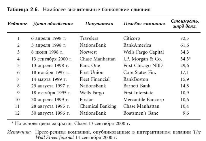 J.P. Morgan и Chase Manhattan. Слияние двух банков позволит объединить всех клиентов «голубой крови» и создать корпоративный франчайзинг, более мощный, чем каждый из банков в отдельности. Кроме того, розничная сеть Chase даст возможность получить большую массу депозитов (т.е. стабильный и дешевый источник финансирования).