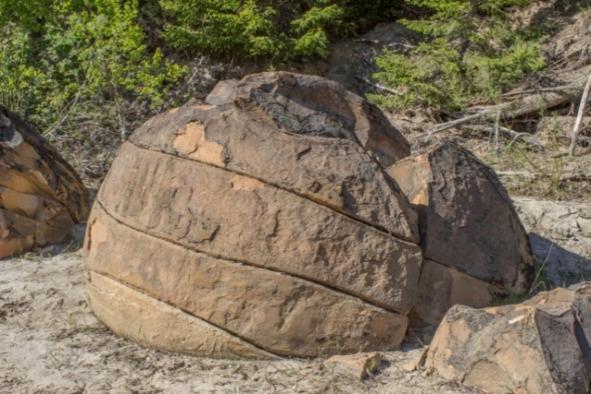 Россия. Красноярский край, возле города Назарово [68]. Очередная феноменальная находка была обнаружена летом 2016 года. На одном из каменноугольных разрезов Красноярского края близ городка Назарово рабочие откопали на глубине 40 метров десяток огромных шаров, каждый диаметром около метра из песчаника. Они были настолько твёрдыми, что их не смог разбить даже ковш бульдозера. Шары были вывезены к бытовкам и расставлены в произвольном порядке. Эта композиция получила название «парка Юрского периода», так как рабочие приняли необычные камни за яйца динозавров. Их догадку подтвердили геологи: шары были рождены именно в ту эпоху.