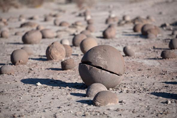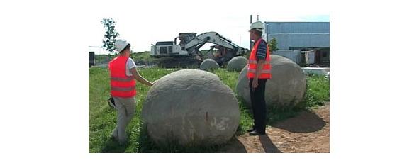 Россия, под Волгоградом [51]. Огромные каменные шары недавно были найденные под Волгоградом. Многие посчитали их окаменевшими яйцами динозавров. Эти шары обнаружил пастух из села Мокрая Ольховка Николай Пехтерев. Спустившись в овраг, Николай увидел, что на самом его дне со стороны горы лежат странные камни шарообразной формы — 12 шаров высотой в метр с небольшим аккуратно торчали из глины, размытой потоками воды, в подозрительно правильном порядке. Расстояние между ними было около трех метров. Николай попробовал отковырнуть от одного кусок, но ничего не получилось. Пастух рассказал об увиденном в селе, и наутро вся Мокрая Ольховка потянулась посмотреть на чудо. Местный тракторист даже прихватил с собой кувалду: после нескольких ударов один из шаров удалось расколоть пополам. К изумлению собравшихся, каменные образования оказались полыми: в полости лежала окаменевшая темная масса. Волгоградские каменные полые шары имеют около метра и более в диаметре и состоят из кремния и металла. На некоторых отчетливо видны следы коррозии, что подтверждает, что в их состав входит какой-то металл. В полостях внутри шаров находилась некая смесь мелкого песка с гранулированным металлом.