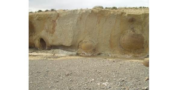Россия. Урочище Батыршатала около поселения Кашхатау, Кабардино-Балкария [67] — рис. 8. Здесь минеральные включения глинисто-карбонатных пород имеют разнообразные формы: дискообразные, гантелеобразные, эллипсовидные, шаровидные и т. д. Они также различаются размерами: от зерен нескольких сантиметров до сфероидов в три и более метров в диаметре. Считается, что конкреции формируются за счет диффузионной концентрации рассеянных компонентов вмещающей среды, процессов перемещения горных пород, а также при кристаллизации коллоидных сгустков. Центрами стяжения могут быть зерна минералов, обломки горных пород, раковины моллюсков, зубы и кости рыб, остатки растений и др.