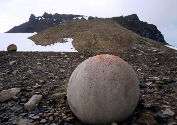 Россия, Земля Франца Иосифа, остров Чамп. Остров Чамп находится далеко на севере на 80 градусе северной широты в Северном Ледовитом океане. Он расположен в центральной части архипелага, состоящего из 192 больших и малых островов, имеющих общее название Земля Франца-Иосифа. Площадь всех остров архипелага — 16134 кв. километров. Размер архипелага, примерно, 200x350 км. Площадь острова Чамп — 374 кв. километра. Его наивысшая точка расположена над уровнем моря на высоте 507 метров [58]. Остров Чамп получил своё название по фамилии руководителя английской спасательной экспедиции Уильяма Чампа, который в июле 1905 году прибыл на архипелаг на шотландском барке «Терра Нова» с целью эвакуации американской полярной экспедиции (исследователей Циглера, Фиала), пытавшейся трижды безуспешно в период 1904—1905 годов добраться до Северного полюса. Территориально архипелаг Земля Франца-Иосифа сегодня входит в состав Приморского района Архангельской области Российской федерации. Остров необитаем и плохо пригоден для жизни, там скалистые обрывы, ураганные ветры и лютые морозы. Периодически его посещают рыбаки, синоптики и учёные. А в последнее время сюда повадились туристы. Привлекают их загадочные каменные шары. Эти валуны идеально круглой формы разбросаны по всему острову. Диаметр многих шаров достигает нескольких метров. Плато, на котором они расположены, напоминает спортивную площадку, где бросали мячики сказочные великаны. Но рядом с крупными валунами множество совсем мелких камешков, размером с шарик для пинг-понга [57] — рис. 5. Остров Чамп относится к наиболее удалённым уголкам России и практически не изучен. Состоят эти шары из плотно спрессованного песка, и происхождение их явно не вулканическое, поскольку в некоторых обнаружены даже зубы древних акул. Когда камни вылезают из земли, они представляют собой правильную сферу, но со временем из-за воздействия сильного ветра, воды и низких температур теряют округлую форму, становятся похожими на обычные булыжники.