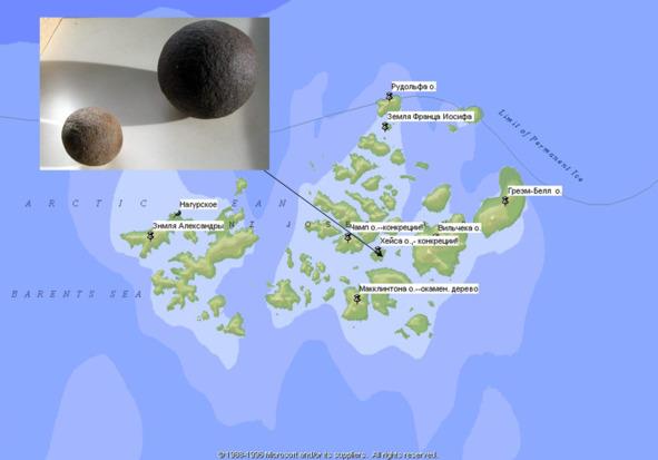 Россия, каменные шары на островах Земли Франца Иосифа и Земли Александры — рис. 7. Кроме указанных островов Чамп и Хейса, каменные шары найдены на острове Греэм-Белл и Рудольфа Земли Франца Иосифа и на острове Нагурское Земли Александры [130].